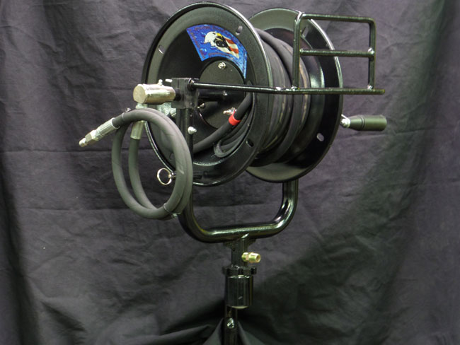 Hot Water Swiveling Hose Reel designed to mount directly on Hot Water Pressure Washers. Holds up to 100 ft. of 3/8” High Pressure Hose.