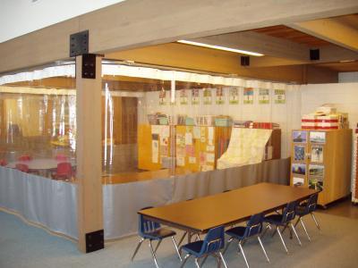 Create instant rooms at substantially less cost than permanent walls. Room divider curtain wall rolls out of the way when not needed.